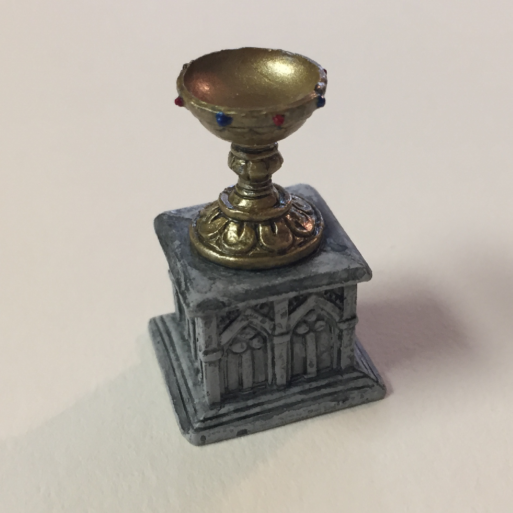 This is a close-up picture of my painted Holy Grail token from Shadows Over Camelot. This was one of the easier paint jobs I’ve done. I painted the grail gold and left the base primer gray. I used a dark metallic wash on the grail to bring out the details, and a flat black wash on the base gray. I was going for a natural stone / marble look, and I was fairly pleased with the results. When that was done I dabbed blue / red paint on the gems, finished the grail with a semi-gloss and the base with a flat finish and it was done!